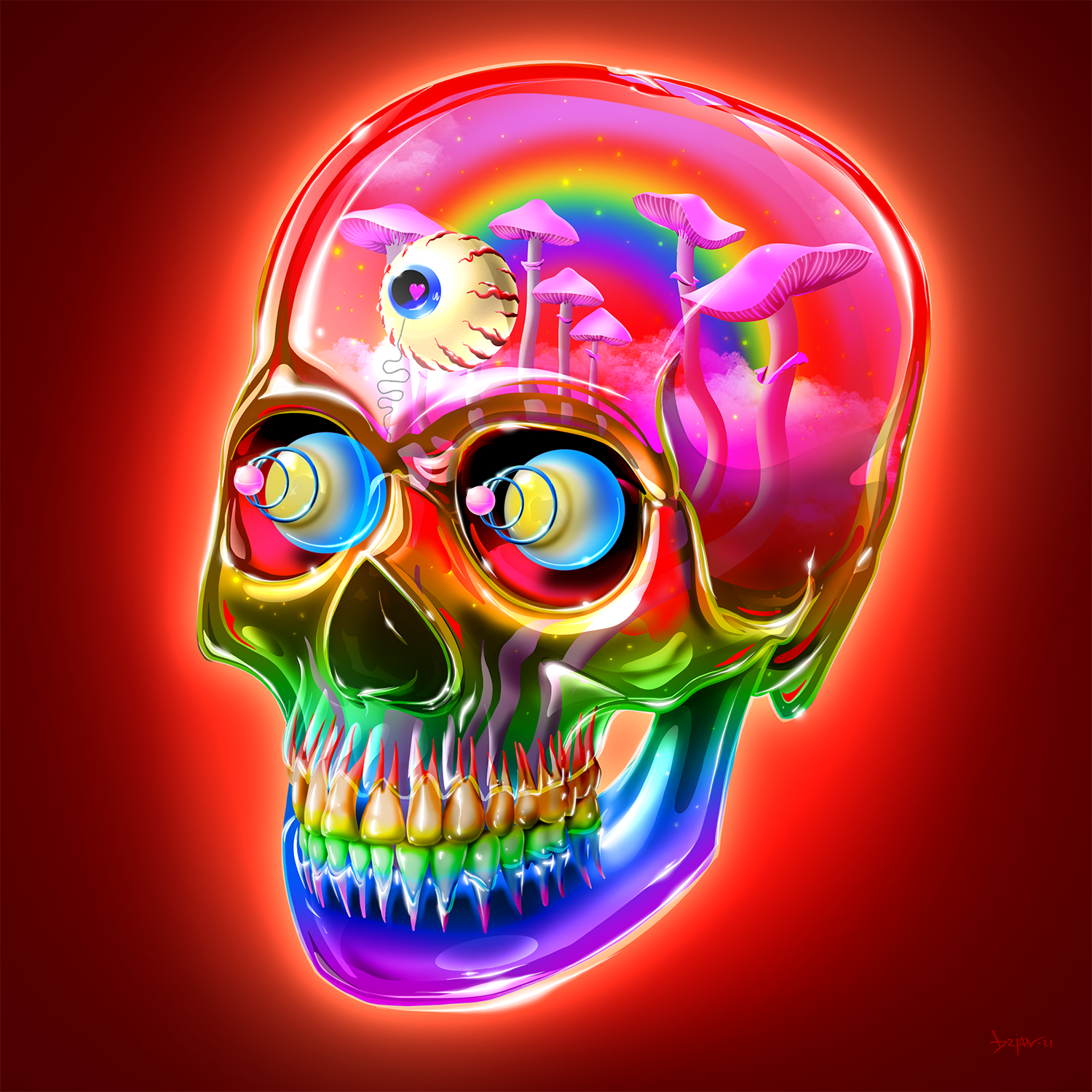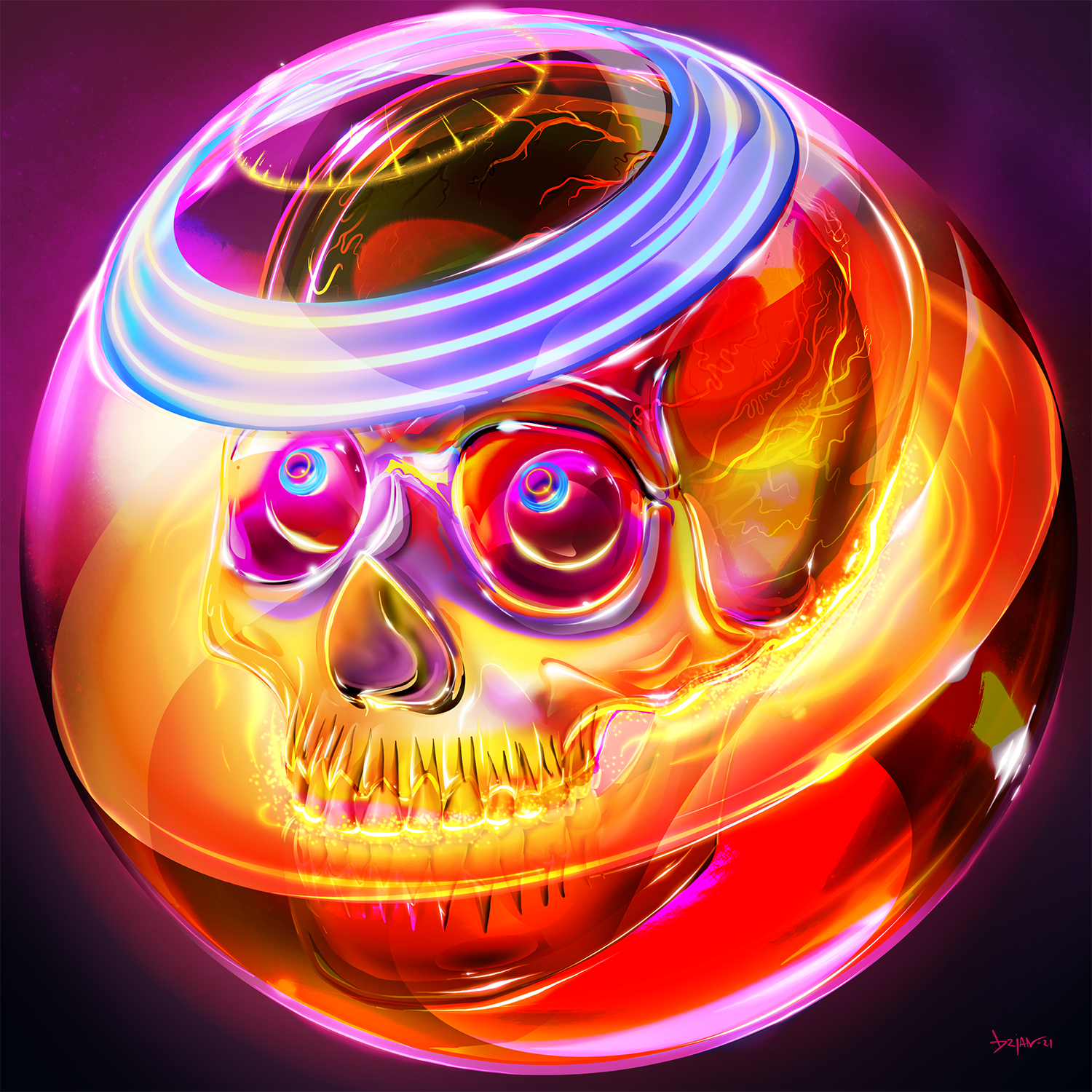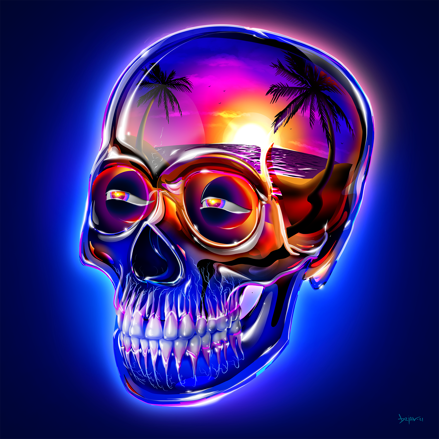 Different vibes, same skull. This series is as much about finding out how far I could push a single illustrated asset as it is about expressing a feeling. Drawn from a skull on my bookshelf, with the intent of being the foundational element in an ongoing series, this particular skull and i have become good friends. Color, light, their eyes and interior are the narrative devices at work.